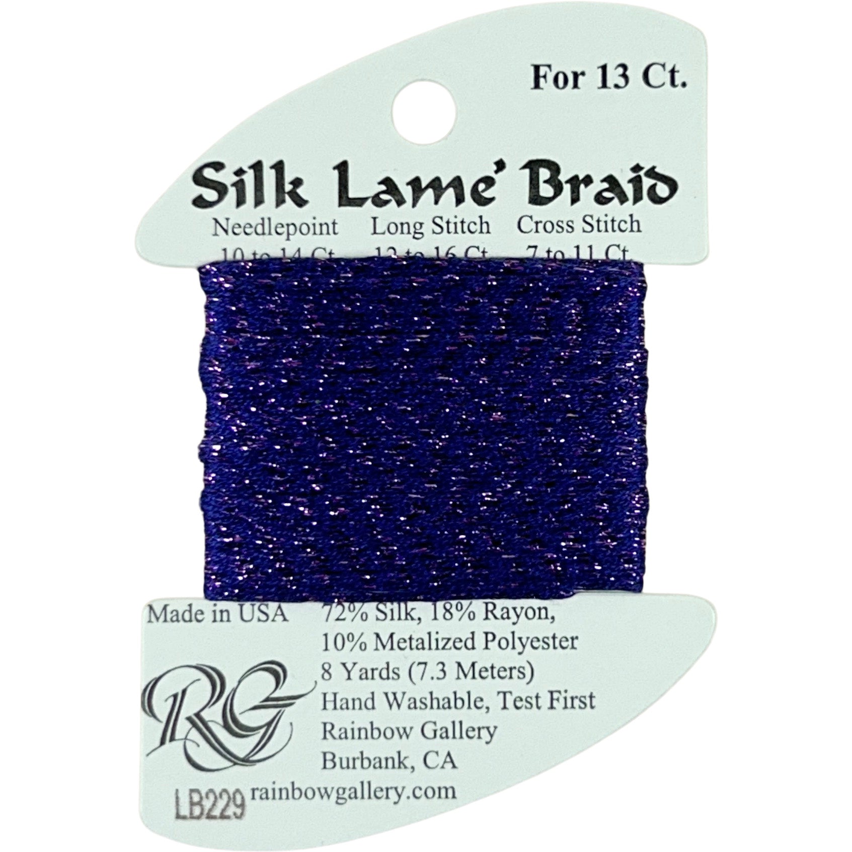 This is Silk Lame Braid 13 from Rainbow Gallery in color 229 Plus Purple. A great thread for adding sparkle to 13 mesh projects. Use as-is on 13 mesh.