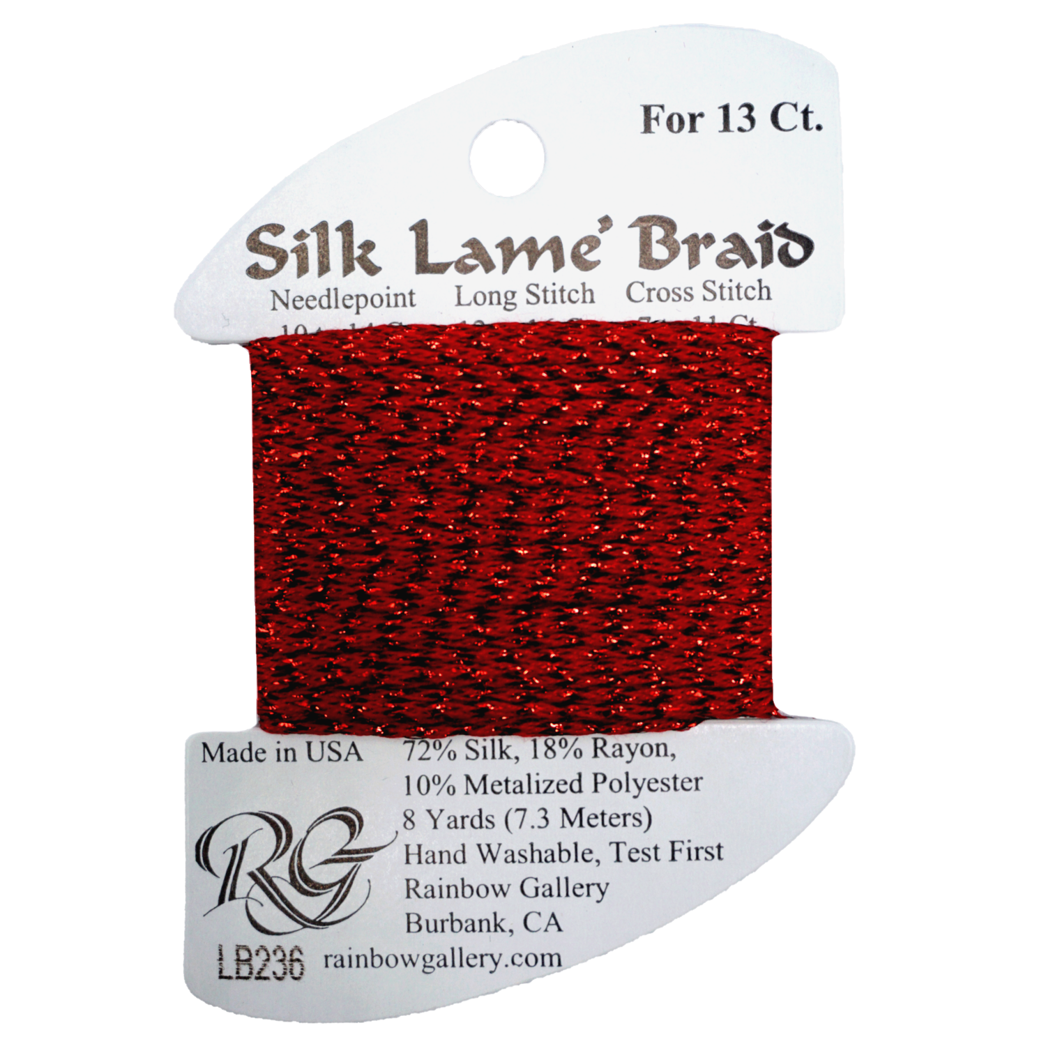 This is Silk Lame Braid 13 from Rainbow Gallery in color 236 True Red. A great thread for adding sparkle to 13 mesh projects. Use as-is on 13 mesh.