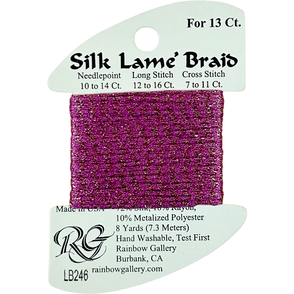 This is Silk Lame Braid 13 from Rainbow Gallery in color 246 Vintage Wine. A great thread for adding sparkle to 13 mesh projects. Use as-is on 13 mesh.