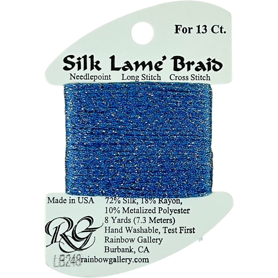 This is Silk Lame Braid 13 from Rainbow Gallery in color 248 Blue Promise. A great thread for adding sparkle to 13 mesh projects. Use as-is on 13 mesh.