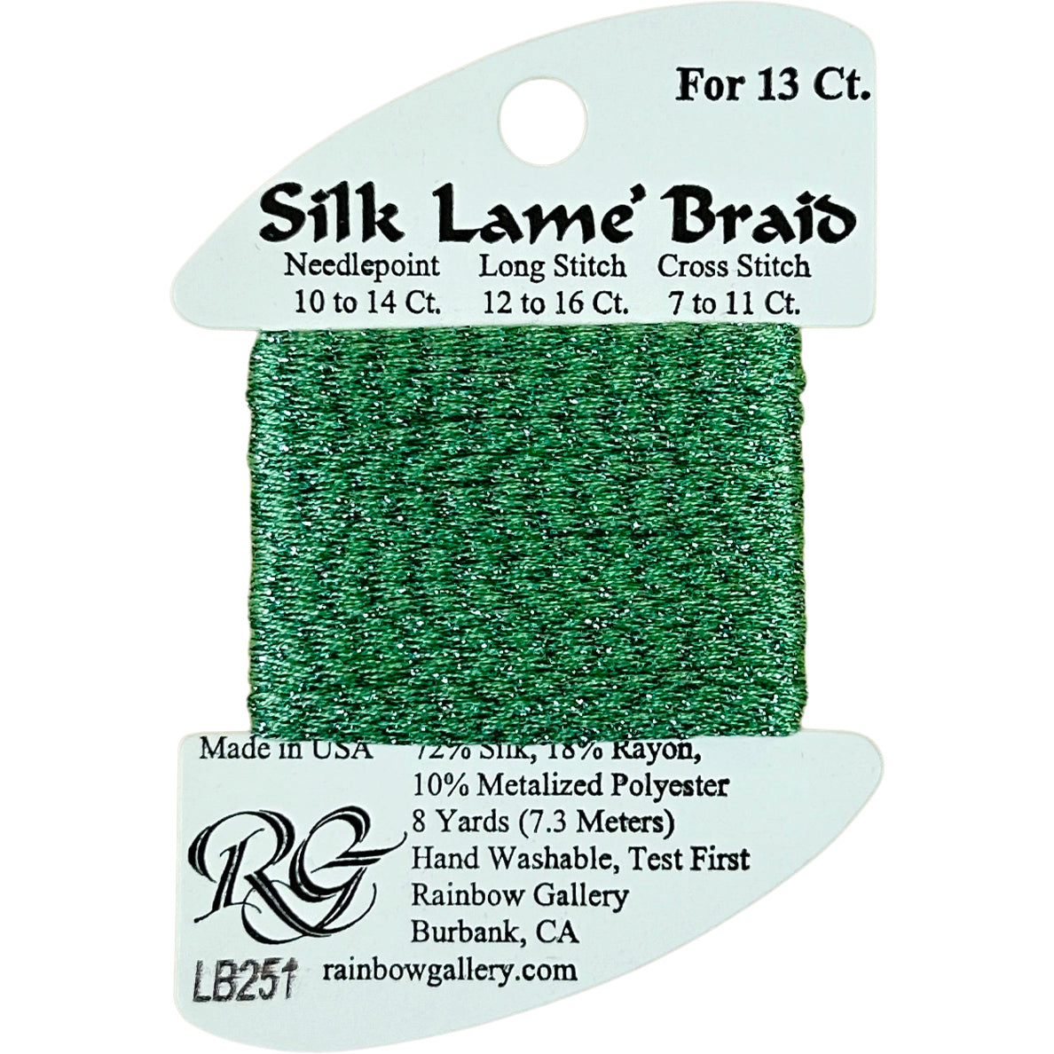 This is Silk Lame Braid 13 from Rainbow Gallery in color 251 Peppermint Patty. A great thread for adding sparkle to 13 mesh projects. Use as-is on 13 mesh.