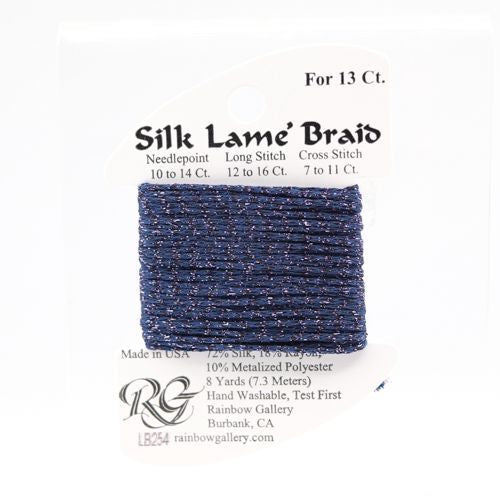 This is Silk Lame Braid 13 from Rainbow Gallery in color 254 Deep Periwinkle. A great thread for adding sparkle to 13 mesh projects. Use as-is on 13 mesh.