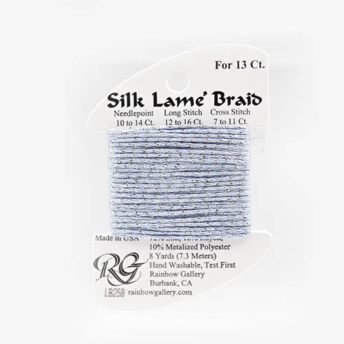 This is Silk Lame Braid 13 from Rainbow Gallery in color 258 Gentle Gray. A great thread for adding sparkle to 13 mesh projects. Use as-is on 13 mesh.
