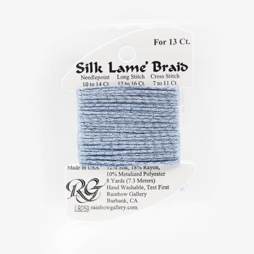 This is Silk Lame Braid 13 from Rainbow Gallery in color 259 Blue Topaz. A great thread for adding sparkle to 13 mesh projects. Use as-is on 13 mesh.