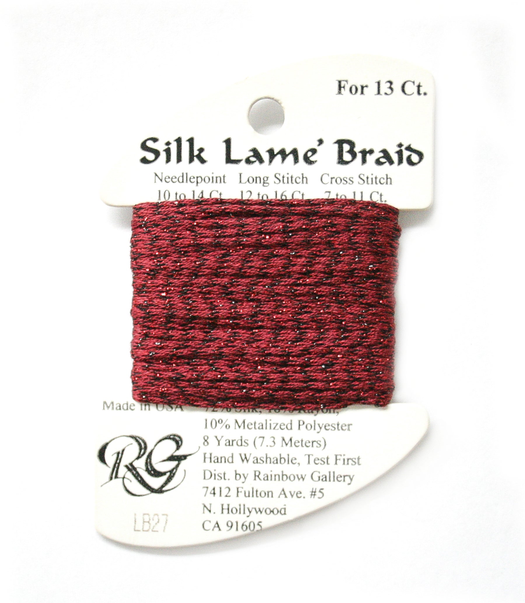 This is Silk Lame Braid 13 from Rainbow Gallery in color 027 Garnet. A great thread for adding sparkle to 13 mesh projects. Use as-is on 13 mesh.