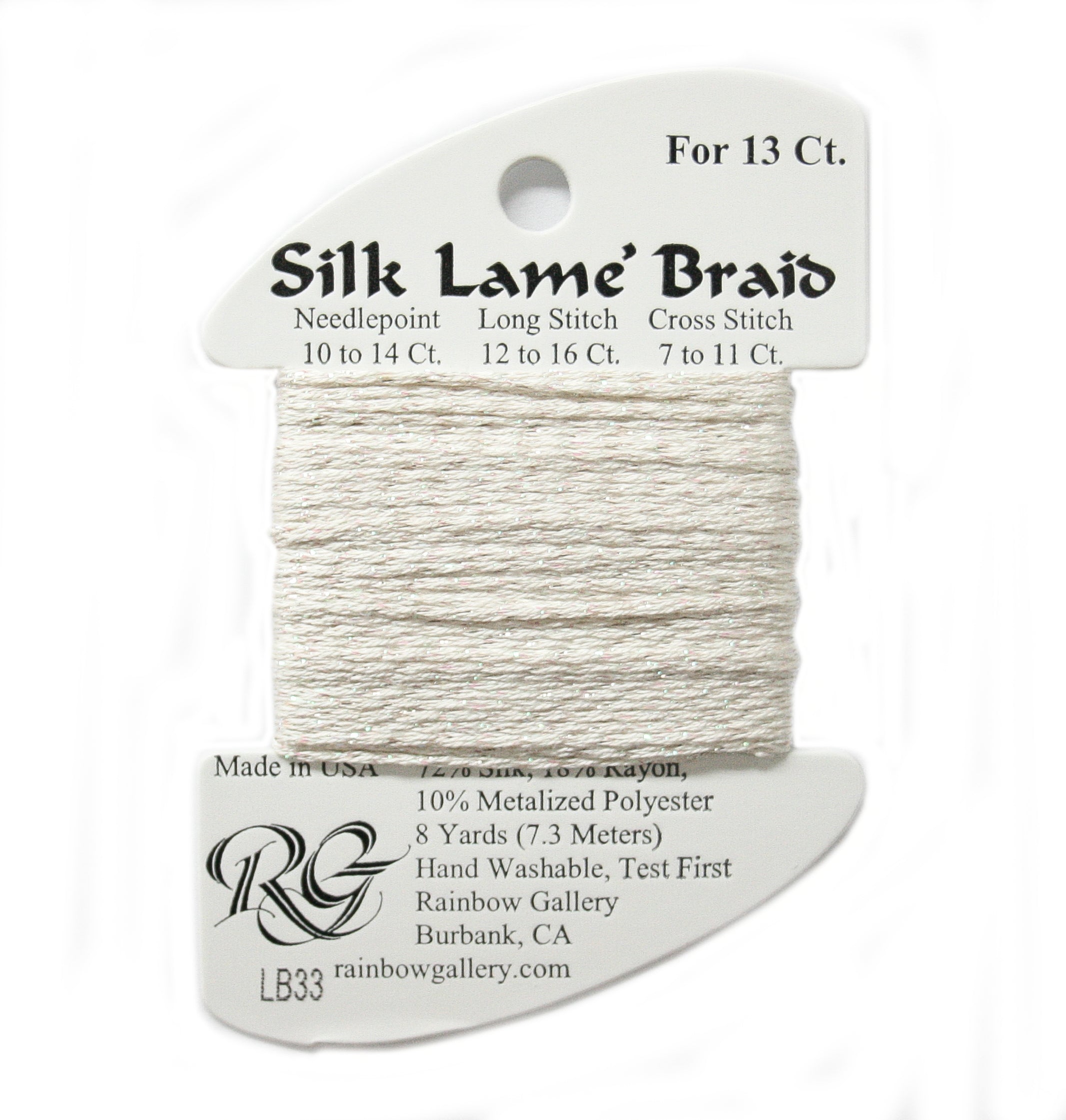 This is Silk Lame Braid 13 from Rainbow Gallery in color 033 Eggshell. A great thread for adding sparkle to 13 mesh projects. Use as-is on 13 mesh.