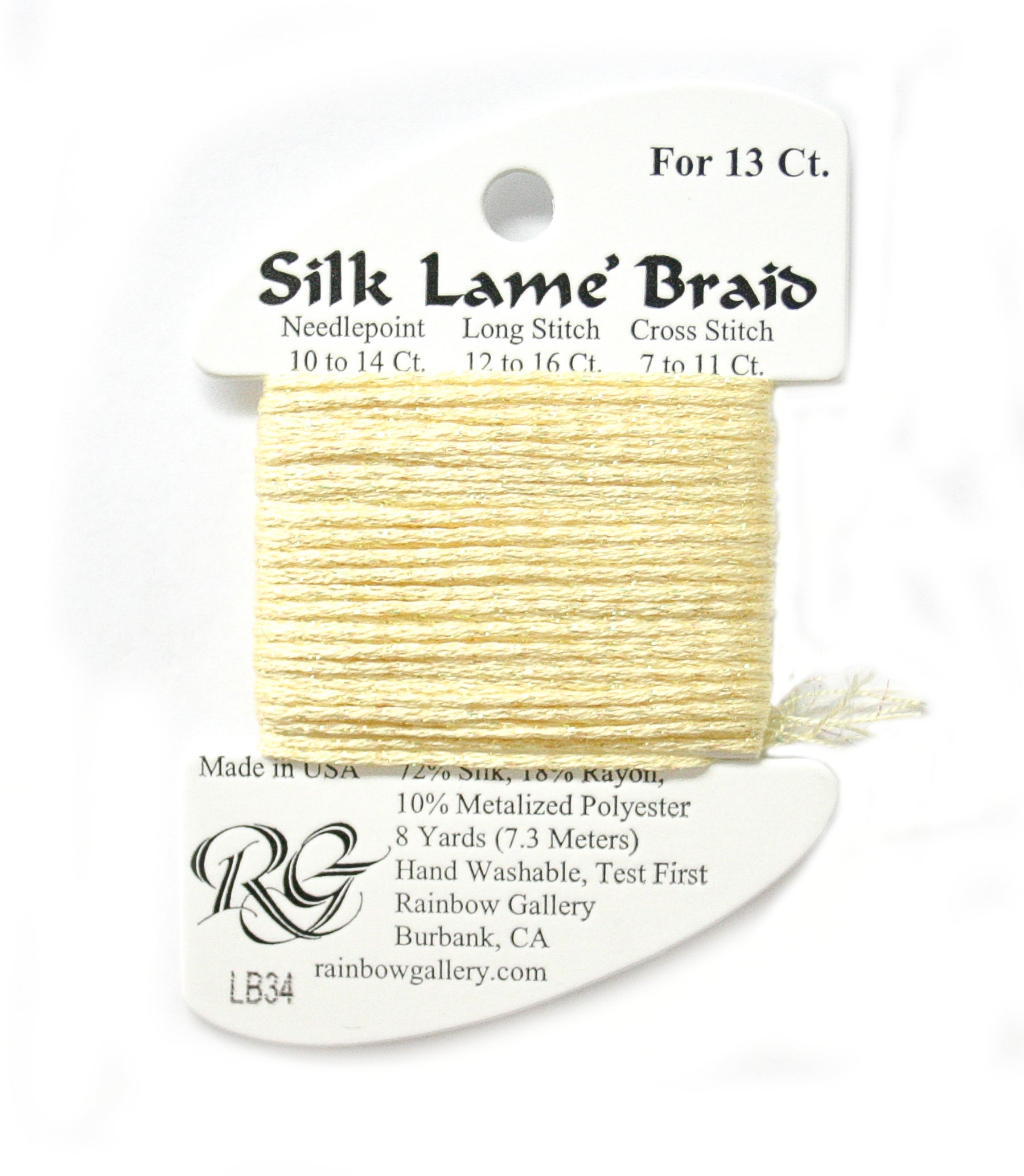 This is Silk Lame Braid 13 from Rainbow Gallery in color 034 Lemon. A great thread for adding sparkle to 13 mesh projects. Use as-is on 13 mesh.