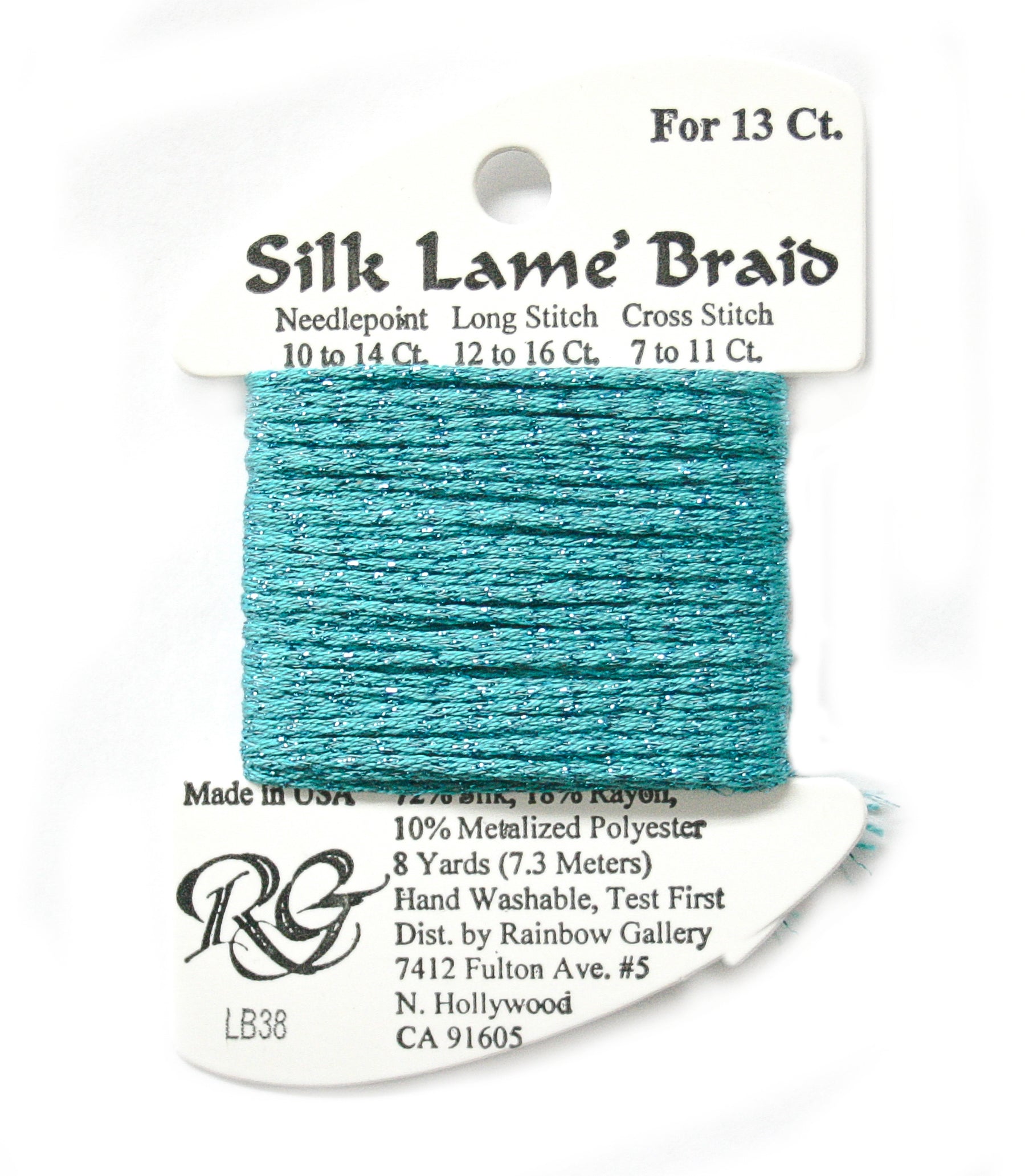 This is Silk Lame Braid 13 from Rainbow Gallery in color 038 Caribbean. A great thread for adding sparkle to 13 mesh projects. Use as-is on 13 mesh.