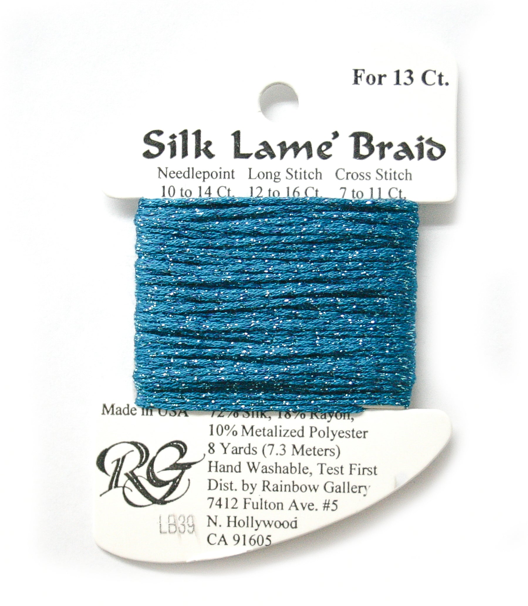 This is Silk Lame Braid 13 from Rainbow Gallery in color 039 Lagoon. A great thread for adding sparkle to 13 mesh projects. Use as-is on 13 mesh.