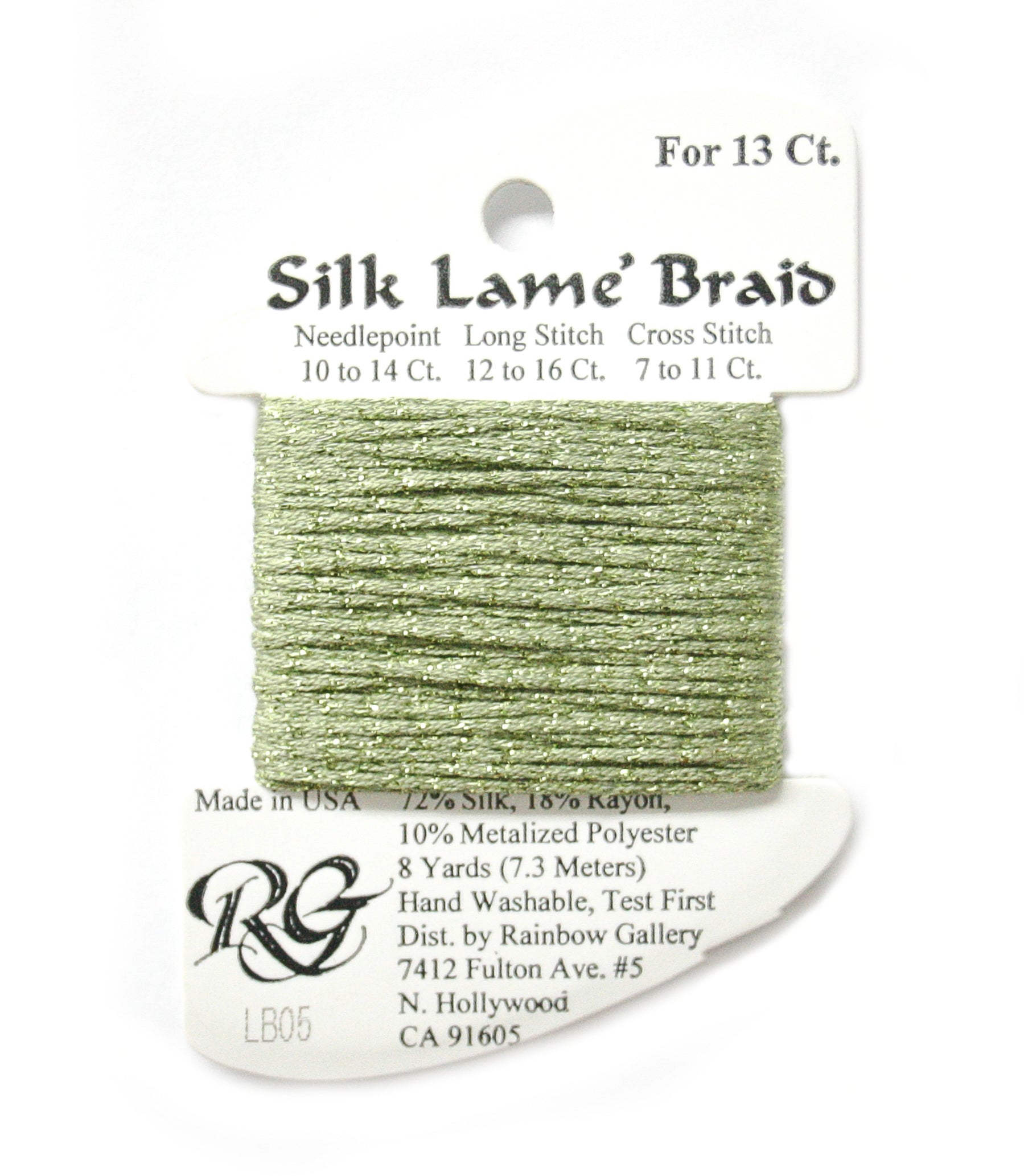 This is Silk Lame Braid 13 from Rainbow Gallery in color 005 Avocado. A great thread for adding sparkle to 13 mesh projects. Use as-is on 13 mesh.