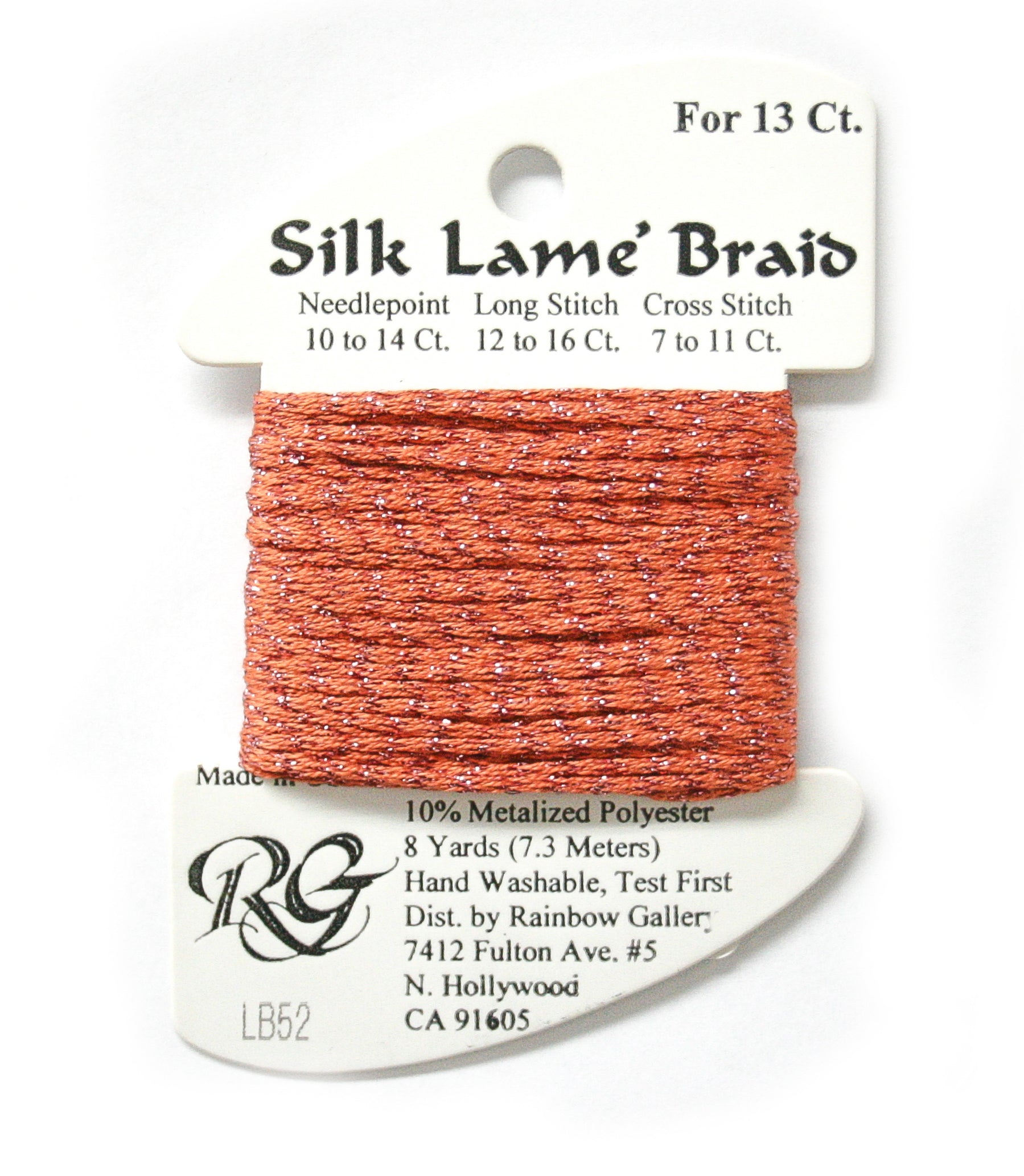 This is Silk Lame Braid 13 from Rainbow Gallery in color 052 Pumpkin. A great thread for adding sparkle to 13 mesh projects. Use as-is on 13 mesh.