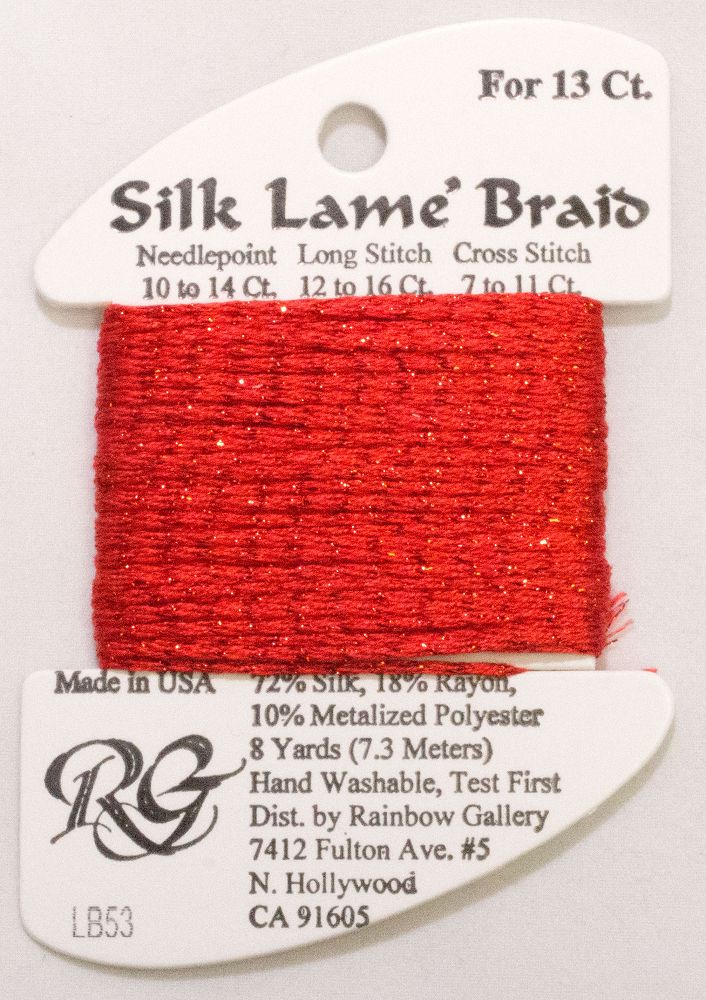 This is Silk Lame Braid 13 from Rainbow Gallery in color 053 Crimson. A great thread for adding sparkle to 13 mesh projects. Use as-is on 13 mesh.