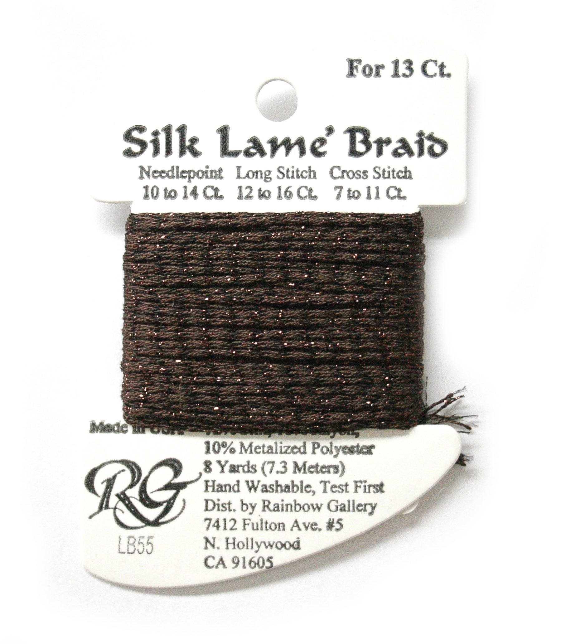 This is Silk Lame Braid 13 from Rainbow Gallery in color 055 Dark Chocolate. A great thread for adding sparkle to 13 mesh projects. Use as-is on 13 mesh.