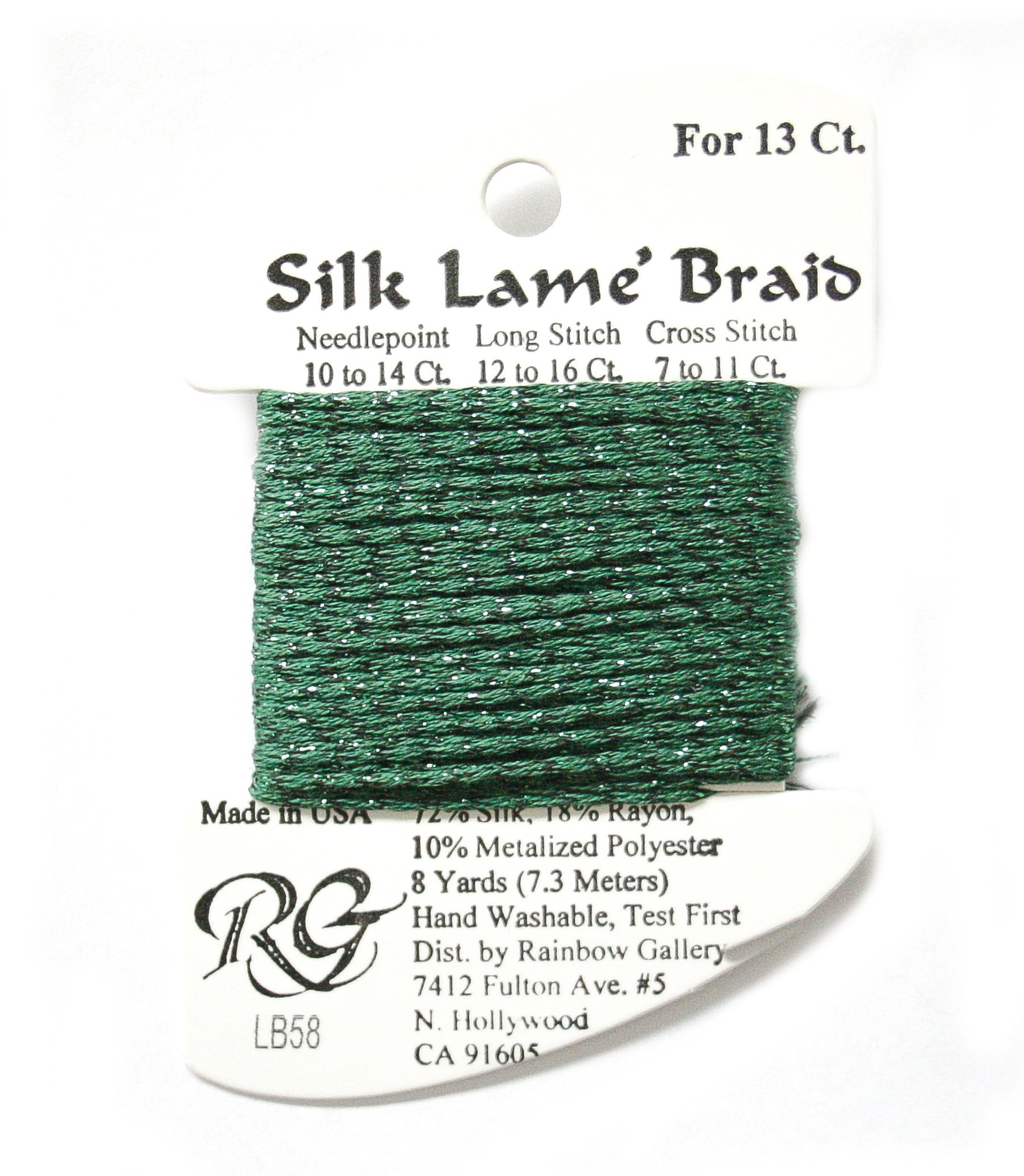 This is Silk Lame Braid 13 from Rainbow Gallery in color 058 Dark Christmas Green. A great thread for adding sparkle to 13 mesh projects. Use as-is on 13 mesh.