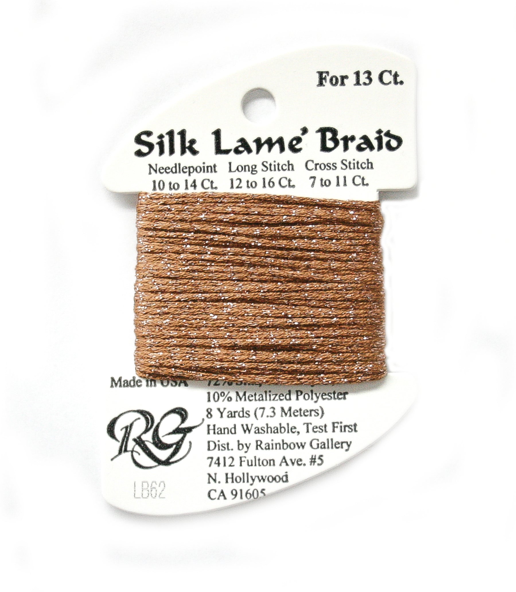This is Silk Lame Braid 13 from Rainbow Gallery in color 062 Dark Sand Gold. A great thread for adding sparkle to 13 mesh projects. Use as-is on 13 mesh.