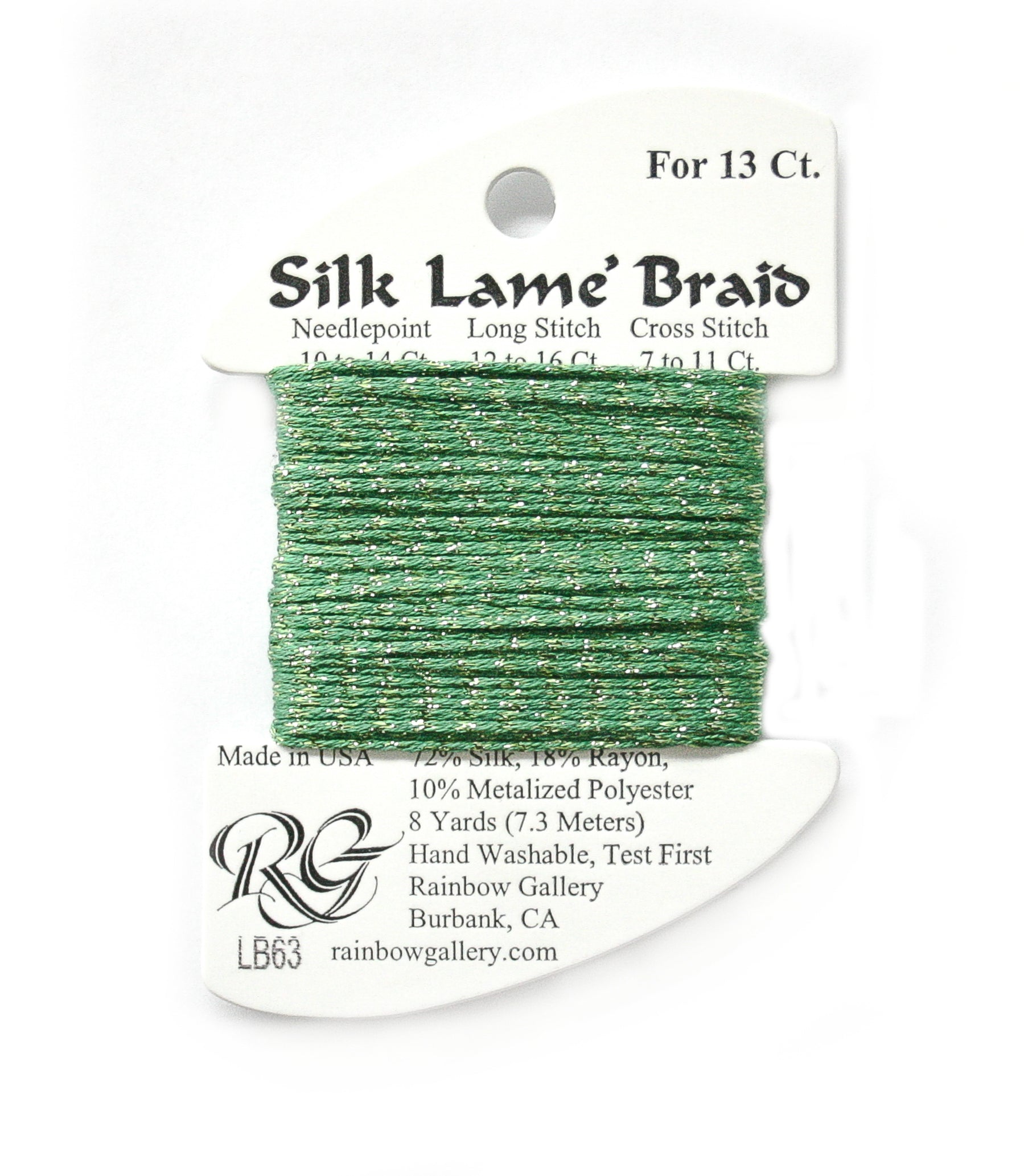 This is Silk Lame Braid 13 from Rainbow Gallery in color 063 Emerald. A great thread for adding sparkle to 13 mesh projects. Use as-is on 13 mesh.