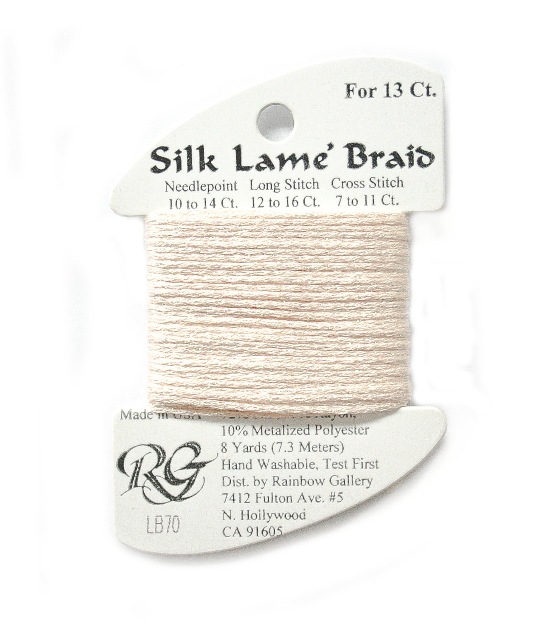 This is Silk Lame Braid 13 from Rainbow Gallery in color 070 Lite Peach. A great thread for adding sparkle to 13 mesh projects. Use as-is on 13 mesh.