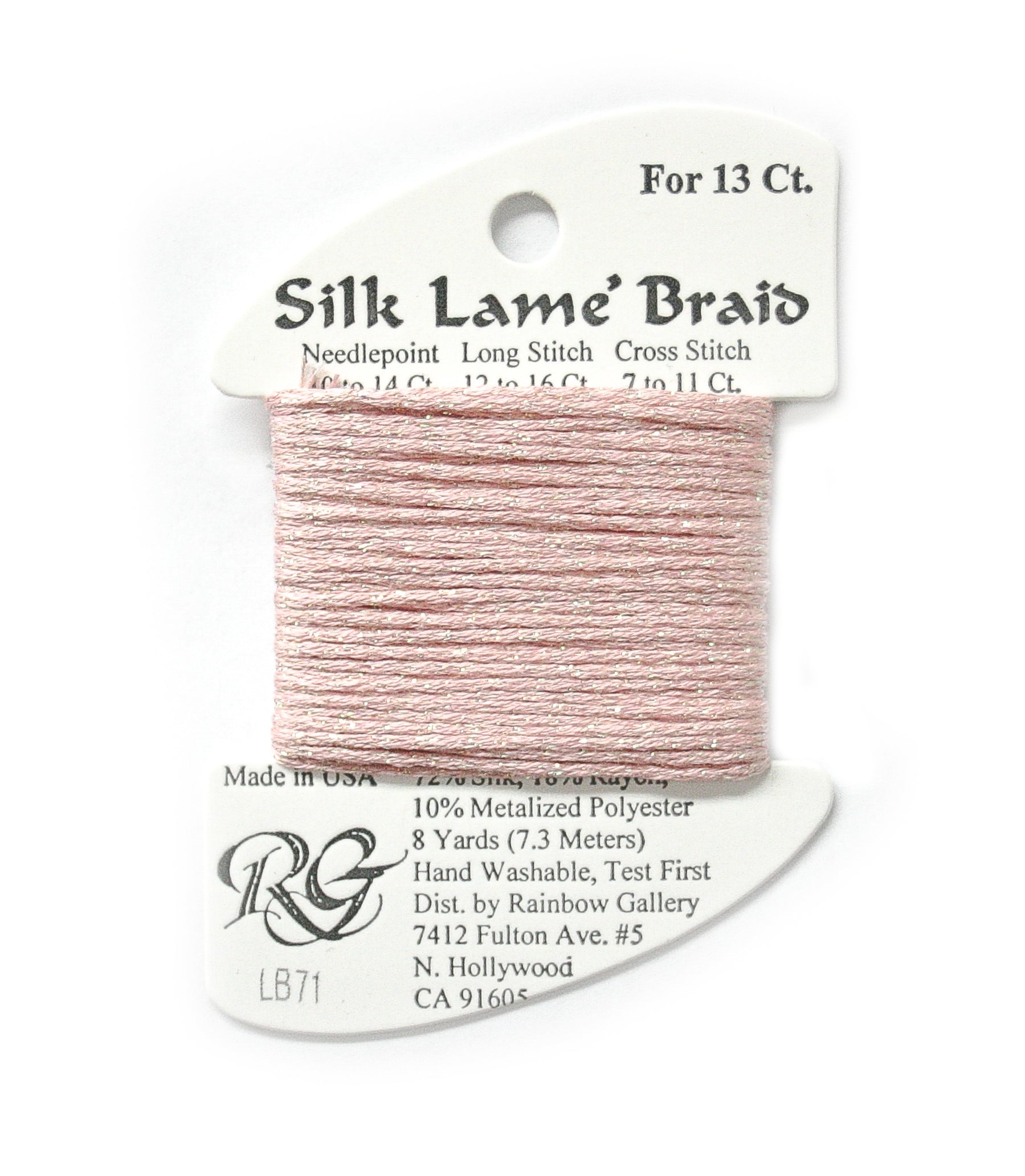 This is Silk Lame Braid 13 from Rainbow Gallery in color 071 Peach. A great thread for adding sparkle to 13 mesh projects. Use as-is on 13 mesh.