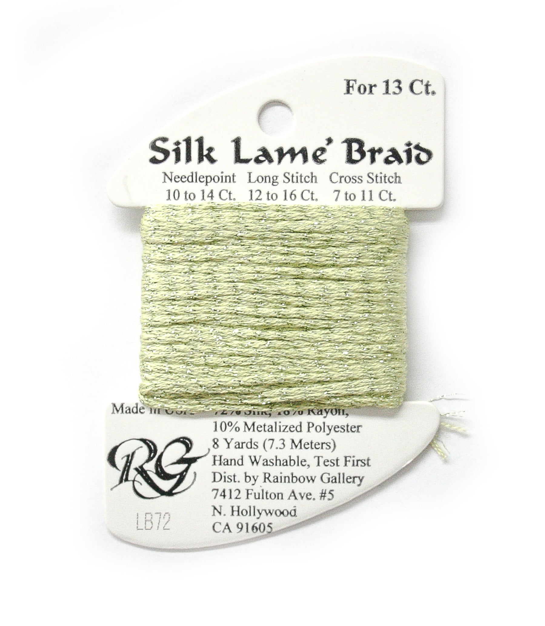 This is Silk Lame Braid 13 from Rainbow Gallery in color 072 Lite Chartreuse. A great thread for adding sparkle to 13 mesh projects. Use as-is on 13 mesh.