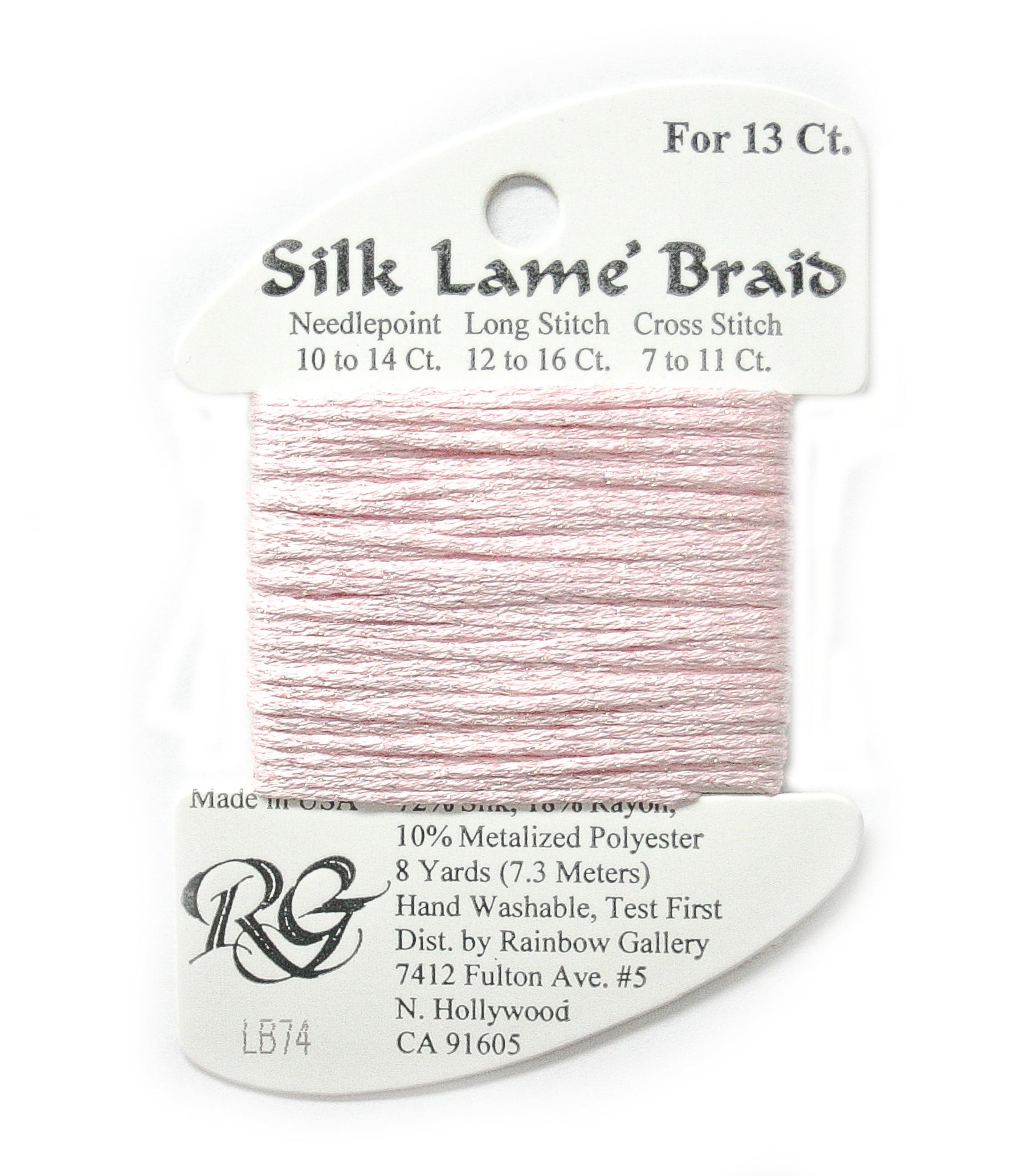 This is Silk Lame Braid 13 from Rainbow Gallery in color 074 Pale Pink. A great thread for adding sparkle to 13 mesh projects. Use as-is on 13 mesh.