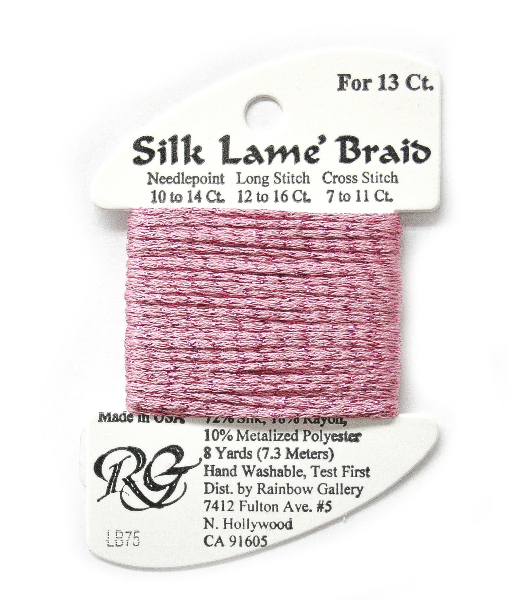 This is Silk Lame Braid 13 from Rainbow Gallery in color 075 Wild Rose. A great thread for adding sparkle to 13 mesh projects. Use as-is on 13 mesh.