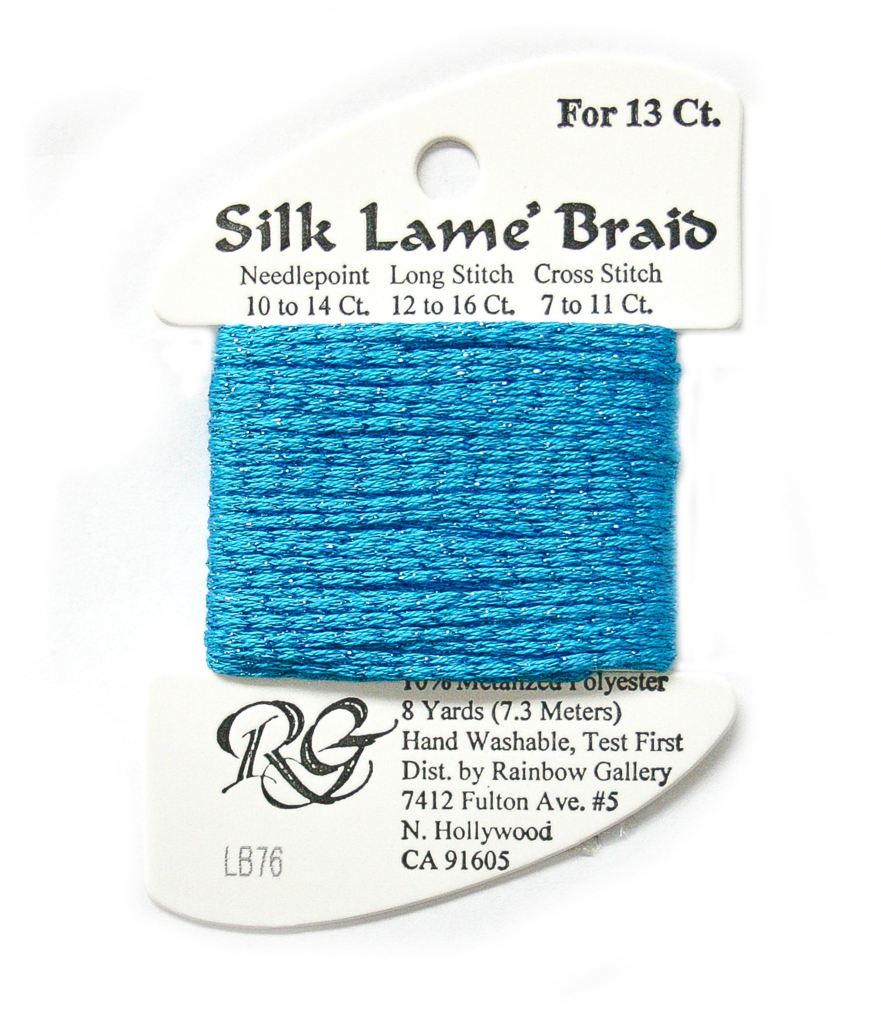 This is Silk Lame Braid 13 from Rainbow Gallery in color 076 Peacock Blue. A great thread for adding sparkle to 13 mesh projects. Use as-is on 13 mesh.