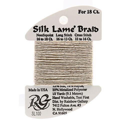 This is Silk Lame Braid 18 from Rainbow Gallery in color 100 Sand. A great thread for adding sparkle to 18 mesh projects. Use as-is on 18 mesh.