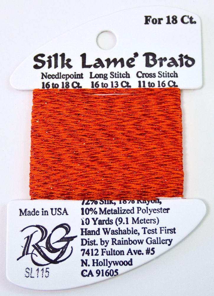 This is Silk Lame Braid 18 from Rainbow Gallery in color 115 Red Orange. A great thread for adding sparkle to 18 mesh projects. Use as-is on 18 mesh.