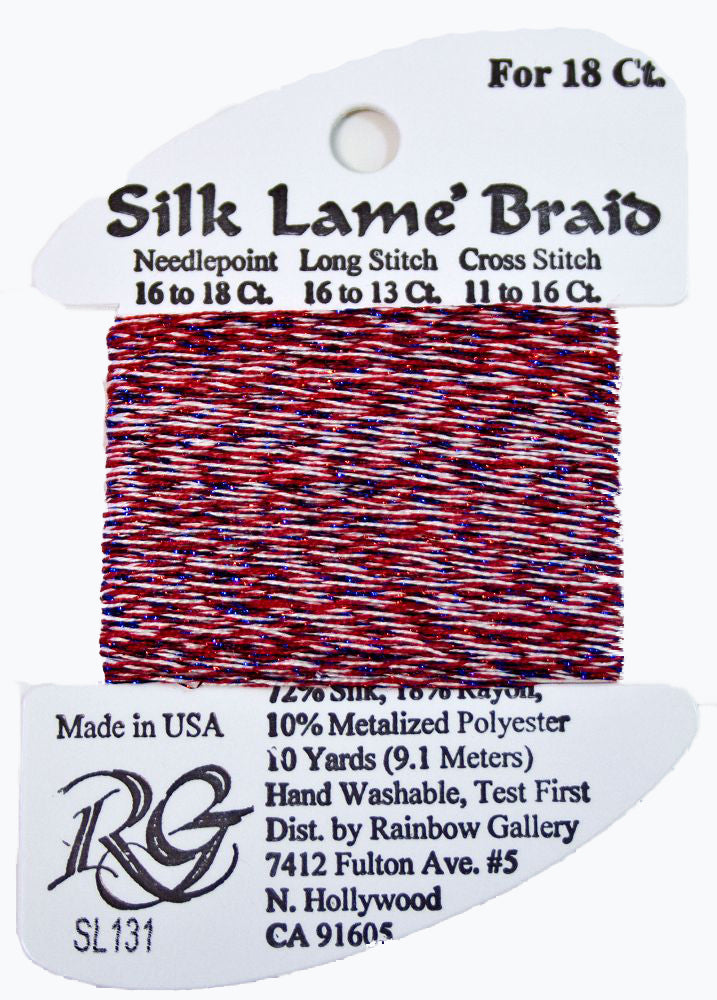 This is Silk Lame Braid 18 from Rainbow Gallery in color 131 4th of July. A great thread for adding sparkle to 18 mesh projects. Use as-is on 18 mesh.