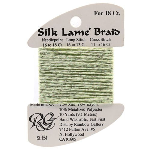 This is Silk Lame Braid 18 from Rainbow Gallery in color 154 Misty Green. A great thread for adding sparkle to 18 mesh projects. Use as-is on 18 mesh.