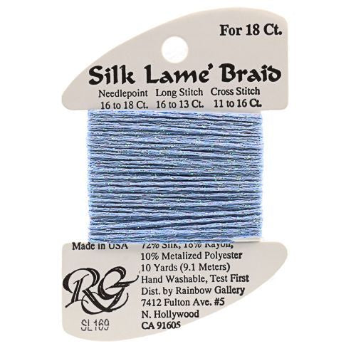 This is Silk Lame Braid 18 from Rainbow Gallery in color 169 Blue Bell. A great thread for adding sparkle to 18 mesh projects. Use as-is on 18 mesh.