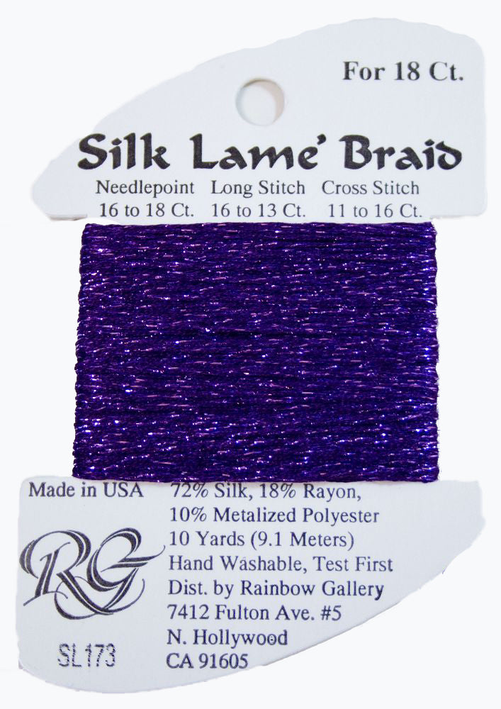 This is Silk Lame Braid 18 from Rainbow Gallery in color 173 Pansy. A great thread for adding sparkle to 18 mesh projects. Use as-is on 18 mesh.