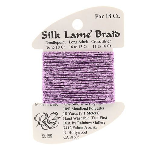 This is Silk Lame Braid 18 from Rainbow Gallery in color 196 Orchid Mist. A great thread for adding sparkle to 18 mesh projects. Use as-is on 18 mesh.
