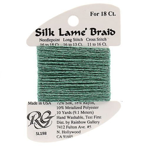 This is Silk Lame Braid 18 from Rainbow Gallery in color 198 Wasabi. A great thread for adding sparkle to 18 mesh projects. Use as-is on 18 mesh.