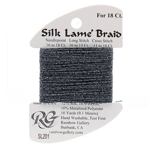This is Silk Lame Braid 18 from Rainbow Gallery in color 201 Gunmetal. A great thread for adding sparkle to 18 mesh projects. Use as-is on 18 mesh.