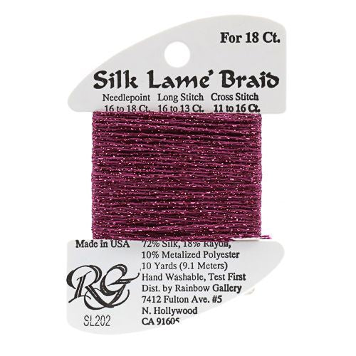This is Silk Lame Braid 18 from Rainbow Gallery in color 202 Wild Plum. A great thread for adding sparkle to 18 mesh projects. Use as-is on 18 mesh.