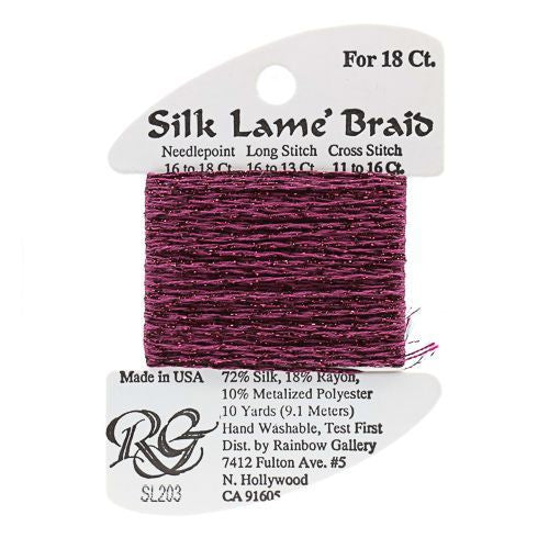 This is Silk Lame Braid 18 from Rainbow Gallery in color 203 Magenta. A great thread for adding sparkle to 18 mesh projects. Use as-is on 18 mesh.
