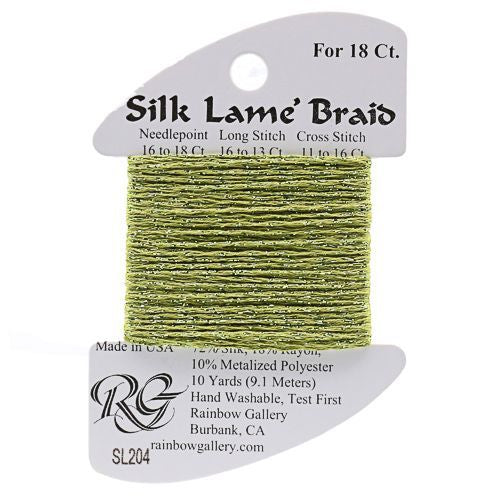 This is Silk Lame Braid 18 from Rainbow Gallery in color 204 Green Olive. A great thread for adding sparkle to 18 mesh projects. Use as-is on 18 mesh.