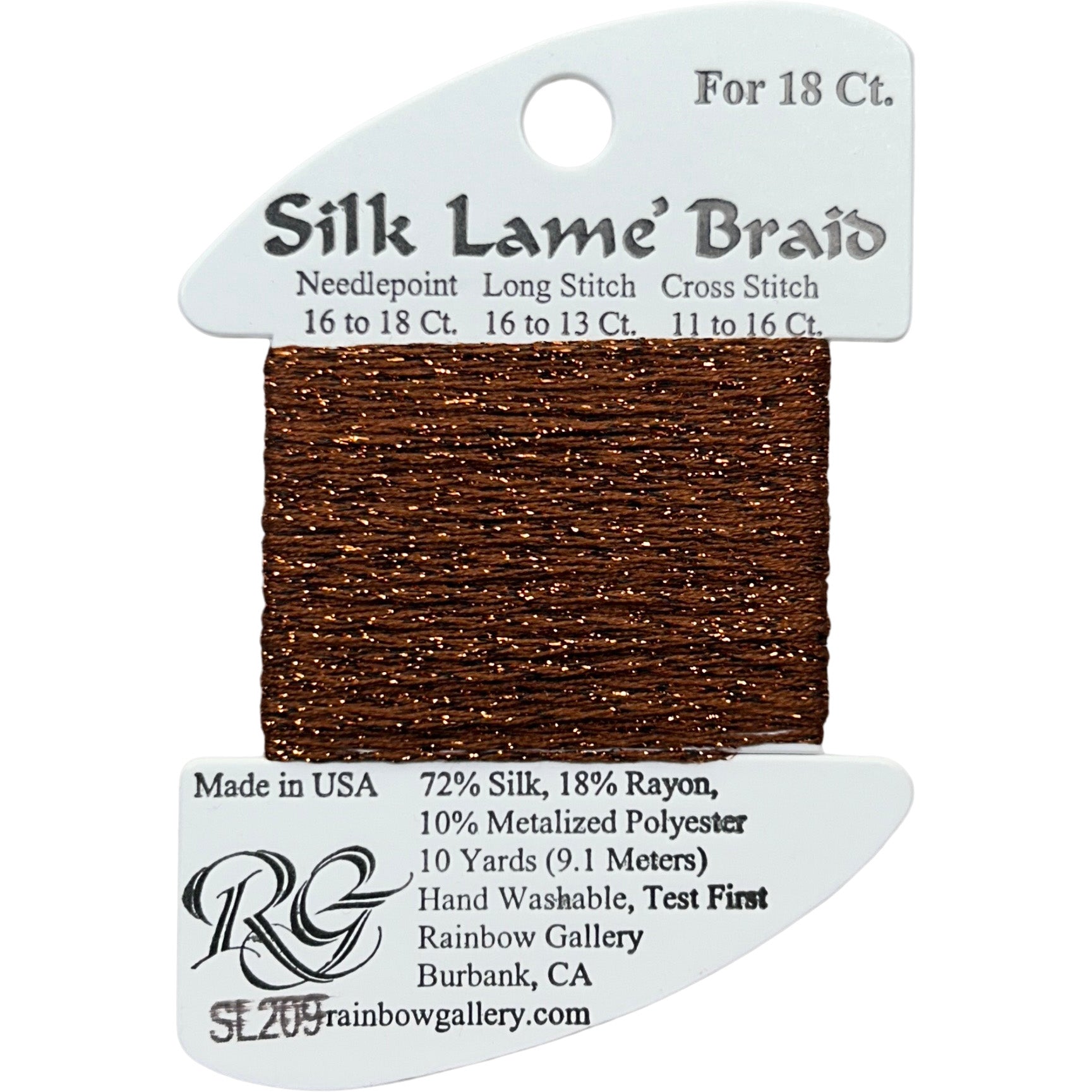 This is Silk Lame Braid 18 from Rainbow Gallery in color 209 Gingerbread. A great thread for adding sparkle to 18 mesh projects. Use as-is on 18 mesh.