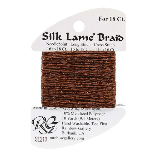 This is Silk Lame Braid 18 from Rainbow Gallery in color 210 Cappuccino. A great thread for adding sparkle to 18 mesh projects. Use as-is on 18 mesh.