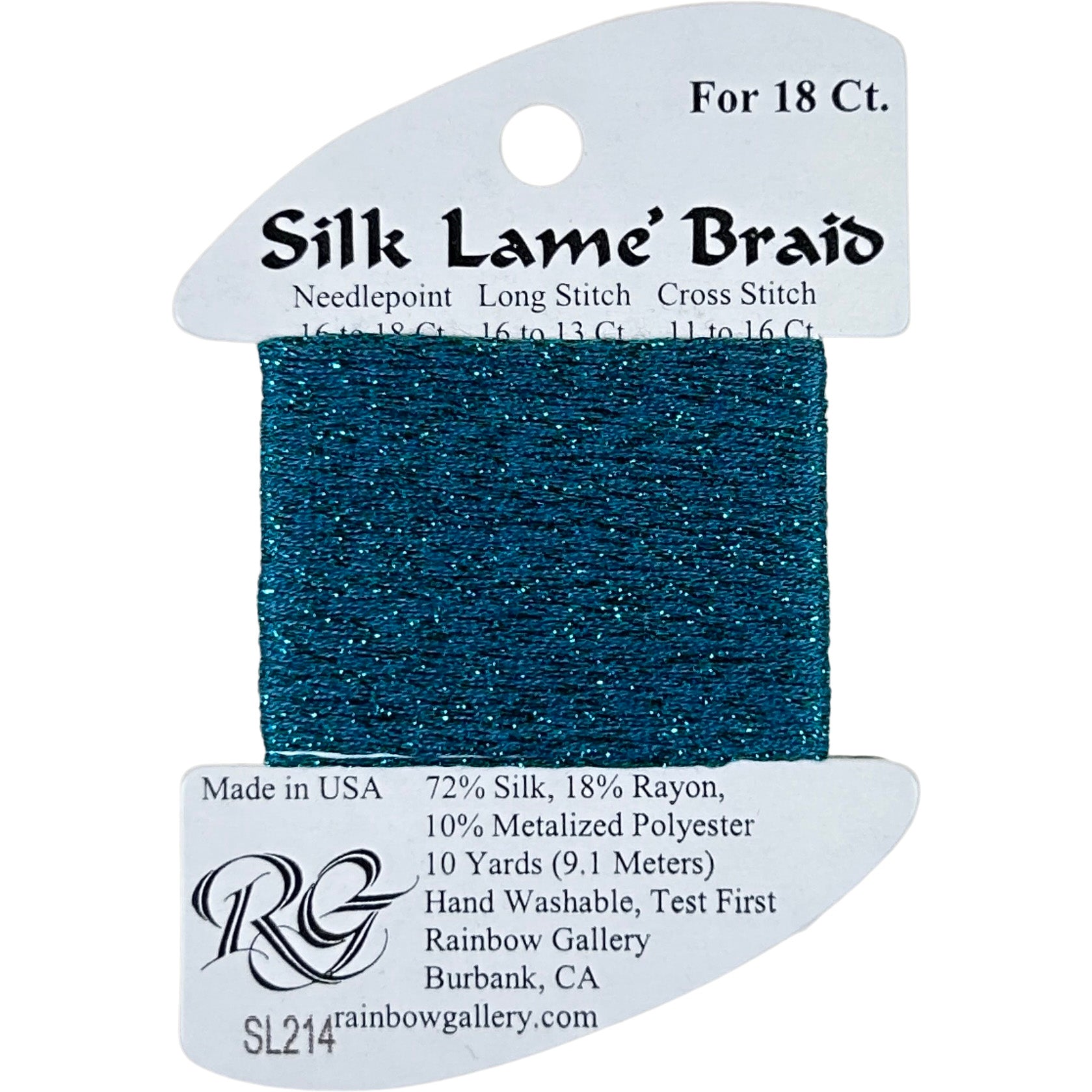 This is Silk Lame Braid 18 from Rainbow Gallery in color 214 Lake Blue. A great thread for adding sparkle to 18 mesh projects. Use as-is on 18 mesh.