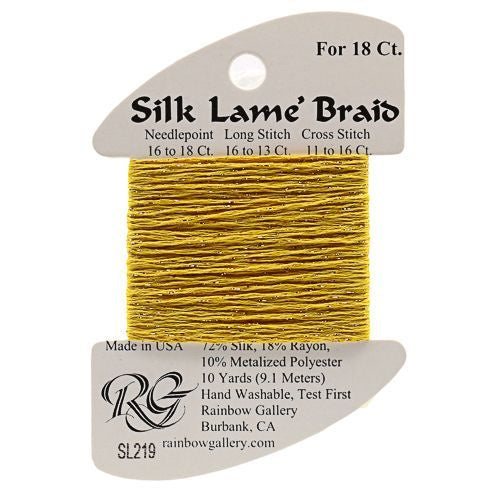 This is Silk Lame Braid 18 from Rainbow Gallery in color 219 Sunset Gold. A great thread for adding sparkle to 18 mesh projects. Use as-is on 18 mesh.