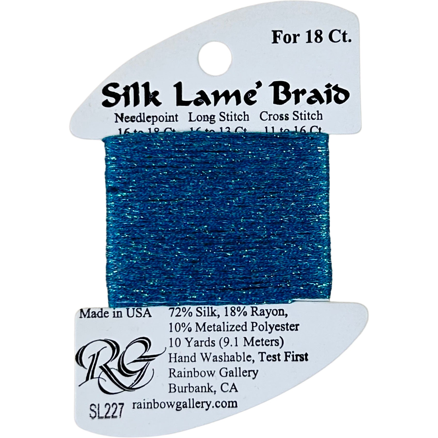 This is Silk Lame Braid 18 from Rainbow Gallery in color 227 Aruba Blue. A great thread for adding sparkle to 18 mesh projects. Use as-is on 18 mesh.