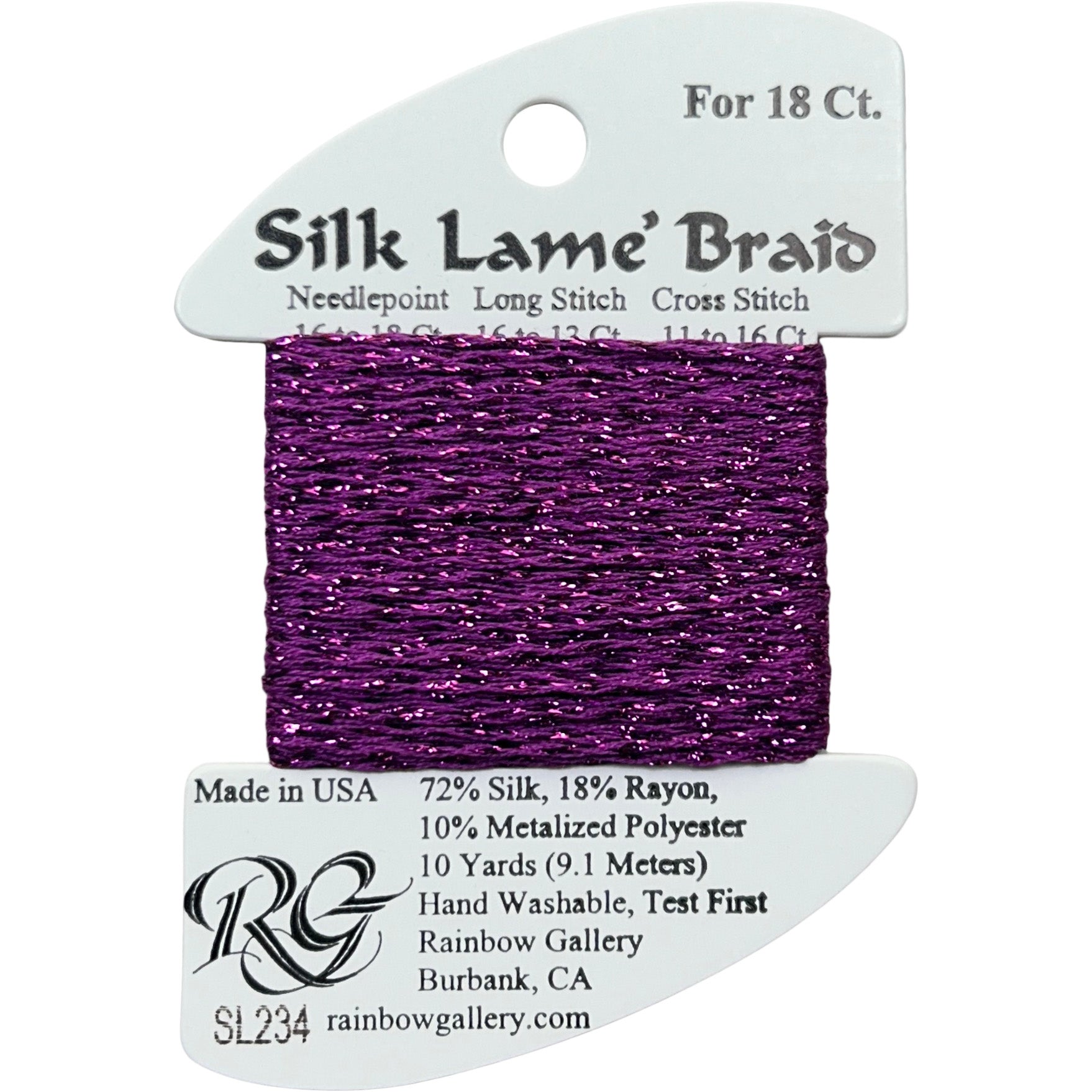 This is Silk Lame Braid 18 from Rainbow Gallery in color 234 Striking Purple. A great thread for adding sparkle to 18 mesh projects. Use as-is on 18 mesh.