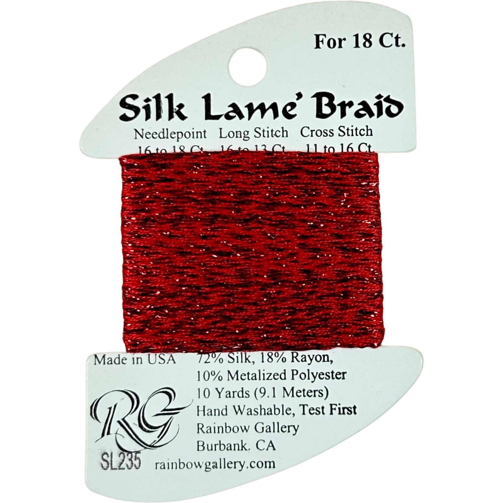 This is Silk Lame Braid 18 from Rainbow Gallery in color 235 Flame Scarlett. A great thread for adding sparkle to 18 mesh projects. Use as-is on 18 mesh.