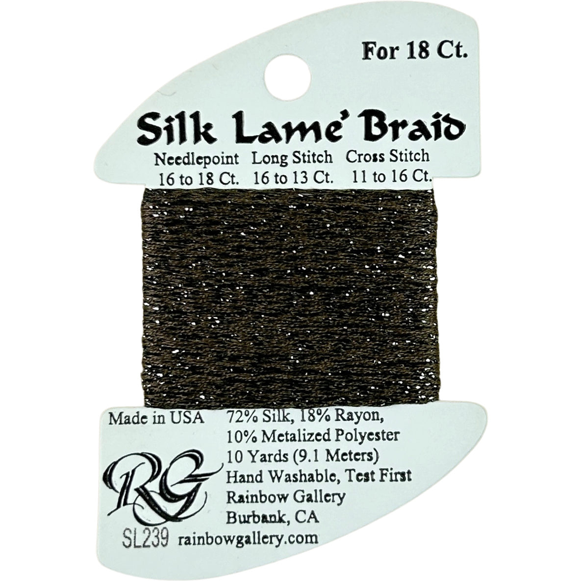 This is Silk Lame Braid 18 from Rainbow Gallery in color 239 Stony Field. A great thread for adding sparkle to 18 mesh projects. Use as-is on 18 mesh.