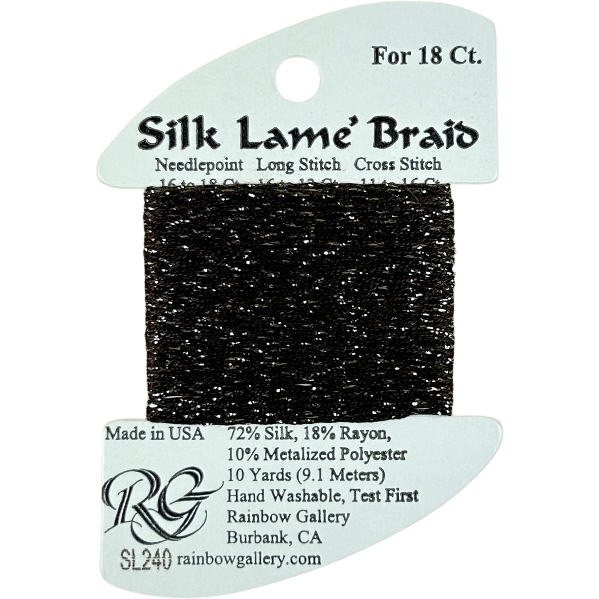 This is Silk Lame Braid 18 from Rainbow Gallery in color 240 Seal Skin. A great thread for adding sparkle to 18 mesh projects. Use as-is on 18 mesh.