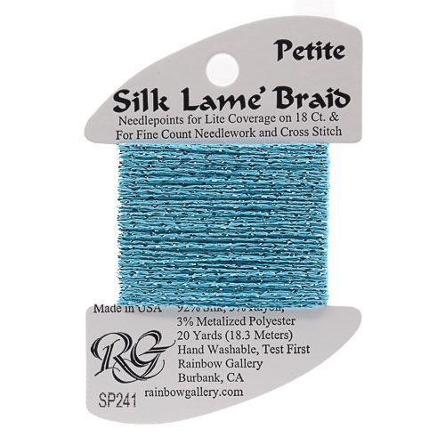 This is Silk Lame Braid 18 from Rainbow Gallery in color 241 Scuba Blue. A great thread for adding sparkle to 18 mesh projects. Use as-is on 18 mesh.