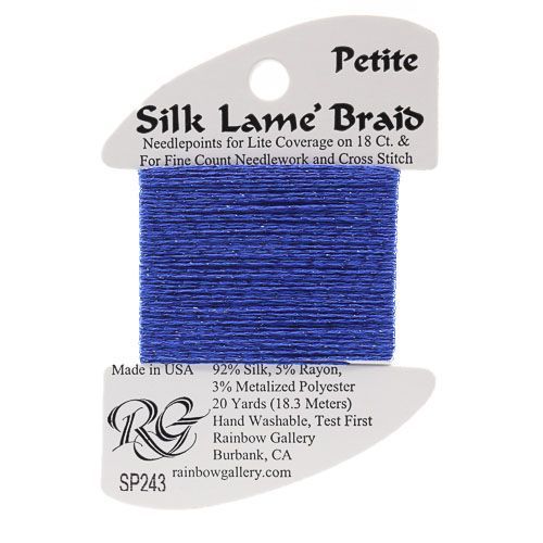 This is Silk Lame Braid 18 from Rainbow Gallery in color 243 Suddenly Sapphire. A great thread for adding sparkle to 18 mesh projects. Use as-is on 18 mesh.