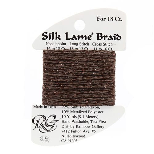 This is Silk Lame Braid 18 from Rainbow Gallery in color 055 Dark Chocolate. A great thread for adding sparkle to 18 mesh projects. Use as-is on 18 mesh.